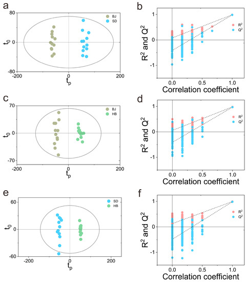 The OPLS-DA analysis of the HS-SPME/GC-MS data. (a) score plot for BJ vs. SD; (b) validation plot of 200 permutation tests for BJ vs. SD; (c) score plot for BJ vs. HB; (d) validation plot of 200 permutation tests for BJ vs. HB; (e) score plot for SD vs. HB; (f) validation plot of 200 permutation tests for SD vs. HB. The slope of R2 > 0 together with the intercept of Q2 on the y-axis < 0 indicating a valid model.
