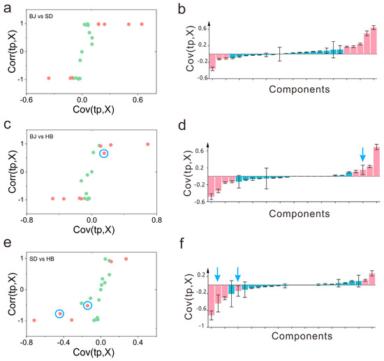 To reveal the potential differential aroma compounds among the three cultivation regions, the following restrictions were taken into consideration. Firstly, the S-plot together with the jack-knifed confidence intervals were employed for potential critical aroma exploring [21]. Secondly, the VIP, expressing the contribution of each variable, was utilized to seek the potential aroma with the threshold greater than 1 [39]. Thirdly, the potential compounds were characterized on the basis of the p values (<0.05) and FC (|log2 (FC)| > 1). The S-plot manifested the covariance and the correlation between the X variables and the predictive score [21]. Both the contribution (covariance, Cov(t, X)) and the reliability (correlation, Corr(t, X)) are shown in the scatter plot. As a matter of fact, the two aspects of high magnitude and high reliability acted together to demonstrate a low risk of spurious correlations. The calculation of Corr(t, X) corresponded to Cov(t, X) and the standard deviation of the t and X variable (). In this study, the criteria for the S-plot was set with |p(cov)| ≥ 0.1 and |p(corr)| ≥ 0.5. The visualization of candidate aroma compounds to distinguish the pair-wised comparison of BJ vs. SD, BJ vs. HB, SD vs. HB together with the jack-knifing confidence intervals are demonstrated in Figure 2. The jack-knifing confidence interval () was determined using SECV, the standard error for each loading, t, the statistical value with α of 0.05, and df, the degrees of freedom.