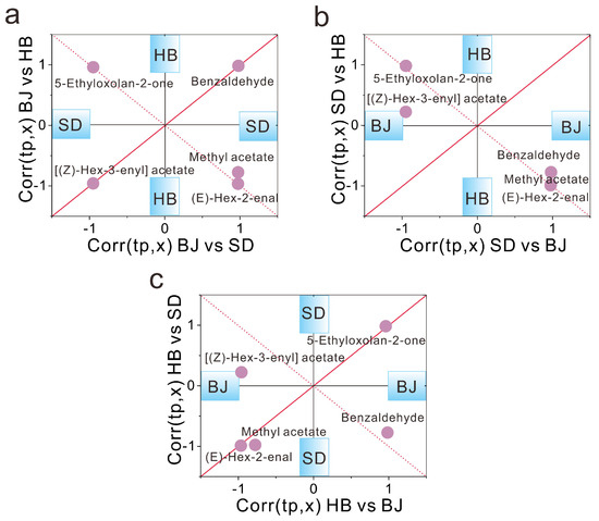 It is worth mentioning that the five compounds acted as the critical potential aroma for three paired comparisons of BJ vs. SD and BJ vs. HB, SD vs. BJ and SD vs. HB, HB vs. BJ and HB vs. SD. To obtain a clear overview on the SUS plots, the five aroma compounds were visualized, see Figure 3. The SUS-plot of the two models of BJ vs. SD and BJ vs. HB are demonstrated on Figure 3a. As seen from Figure 3a, all the five potential crucial compounds were regarded as the shared critical aroma along the diagonal line of SD and HB. With respect to the two models of SD vs. BJ and SD vs. HB (Figure 3b), the shared aroma compounds of HB and BJ spanned four compounds (methyl acetate, (E)-hex-2-enal, benzaldehyde, 5-ethyloxolan-2-one), while one ([(Z)-hex-3-enyl] acetate) was ascribed as a unique feature (concentration significantly higher) to BJ with the p(corr) close to 0 for HB. As far as the models of HB vs. BJ and HB vs. SD (Figure 3c), four critical compounds of methyl acetate, (E)-hex-2-enal, benzaldehyde, 5-ethyloxolan-2-one were considered as the common characteristics of SD and BJ, whereas [(Z)-hex-3-enyl] acetate was determined as the particular compound for BJ with the p(corr) close to 0 for SD.