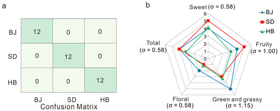 (a) The confusion matrix of PLS-DA model; (b) the sensory evaluation of the aroma profiles of peach from three cultivation regions of BJ, SD, and HB.