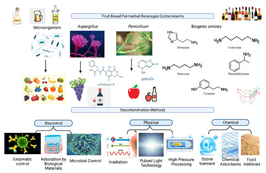 Mycotoxin contamination in fruit fermented beverages is an ongoing concern for public health. Patulin (PAT), aflatoxins (AFs), and ochratoxin A (OTA) are the most prevalent mycotoxins that contaminate raw materials and derivates [44]. Mycotoxin exposure can be controlled in two ways: decontamination and preventive measures. Decontamination approaches used to completely deactivate or remove these high-toxicity mycotoxins include biological, physical, and chemical tools. Nevertheless, some techniques are less effective and occasionally prohibited because of concerns regarding safety, the potential loss of nutritional content of the treated products, and the expense of application [45]. Overall, it is important to consider the efficiency, processability, and cost of the decontamination methods, as well as the potential impact on the product. The principal contaminants of fruit fermented beverages and the removal techniques are shown in Figure 1.