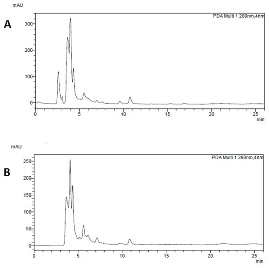 Chromatogram of Cannellino (A) and Piattellino (B) BF. The main compounds that could be identified in the chromatogram are hydroxycinnamic derivatives, namely those at RT = 9.2 and 10.4 min in good amounts in Cannellino, and minority compounds at RT = 15.3 and 16.8 min.