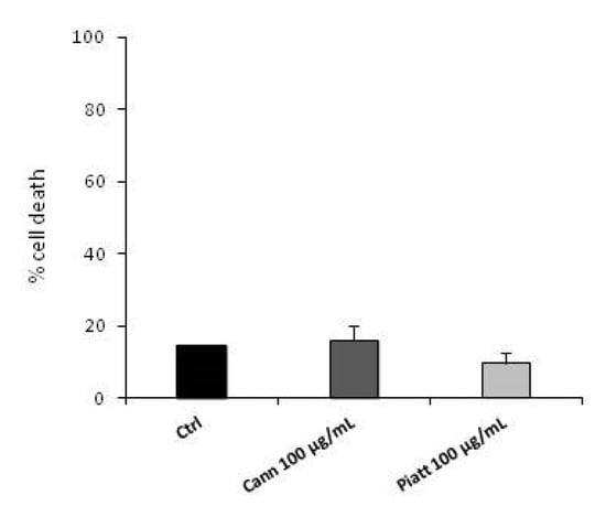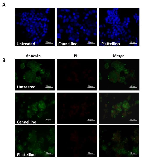 Previous reports indicate that extracts from different varieties of P. vulgaris can promote apoptosis of melanoma and colon cancer cells [20,21]. To verify whether our extracts induced cell apoptosis, HT29 cells were treated for 18 h with 100 µg/mL of Cannellino and Piattellino BF, and DAPI staining was applied to evaluate nuclear changes that occur during the apoptotic process. As evident in Figure 7A, both extracts did not modify nuclear integrity. Similarly, immunostaining with annexin V and propidium iodide (PI) indicated that neither the apoptotic process not the necrotic process was activated by BF (Figure 7B).