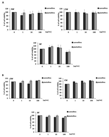 Either 3.5 × 103 (HT29), 2.5 × 103 (HCT116), 3.0 × 103 (HaCaT), or 1.5 × 103 (FU) cells/well were seeded in 96-multiwell plates in medium with 10% FBS, and after adherence were maintained for 24 h in medium containing 0.1% serum. After 24 h, cells were treated with different concentrations (1, 10, and 100 µg/mL) of Piattellino and Cannellino bean samples (SW, CW, BF), and the blank solution. After 48 h, the medium was removed, and cells were incubated for 4 h with fresh medium in the presence of 1.2 mM MTT (3-(4,5-dimethylthiazol-2-yl)-2,5-diphenyltetrazolium bromide) (Sigma-Aldrich). Then, the supernatant of each well was removed and 50 µL of dimethyl sulfoxide was added into the well to dissolve the blue formazan crystals. Cell viability was evaluated by measuring the absorbance at 595 nm using a microplate reader (EnVision, PerkinElmer, Waltham, MA, USA). Data were expressed as a percentage of the basal control.