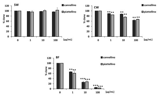 HT29 cells were plated in 24 multi-well plates (350 cells/dish) in a medium containing 10% FBS (Euroclone, Milano, Italy). After 24 h, cells were treated with Cannellino and Piattellino SW, CW, and BF samples (1–10–100 μg/mL) in 1% FBS (v/v) and kept for 10 days. Colonies were fixed with methanol, stained, and counted (>50 cells) [27].