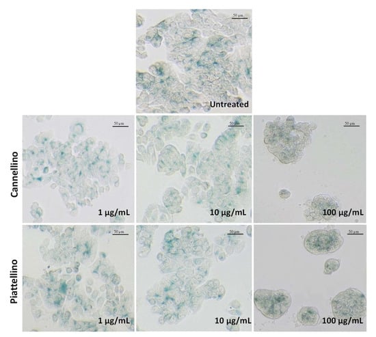 HT29 cells were seeded in 24 multi-well plates (7.5 × 104 cells/well) in RMPI medium with 10% FBS. After adherence, cells were treated with Cannellino or Piattellino BF (1, 10, and 100 µg/mL) for 24 h. Senescence was determined using a senescence β-galactosidase staining kit (cell signaling). Briefly, cells were washed with PBS, fixed with fixative solution, and incubated with β-galactosidase staining solution at pH 6.0, 37 °C, overnight in a dry incubator. While the β-galactosidase was still on the plate, cells were checked under an ECLIPSE Ts2 microscope, and images were obtained using NIS-Elements software (Nikon).