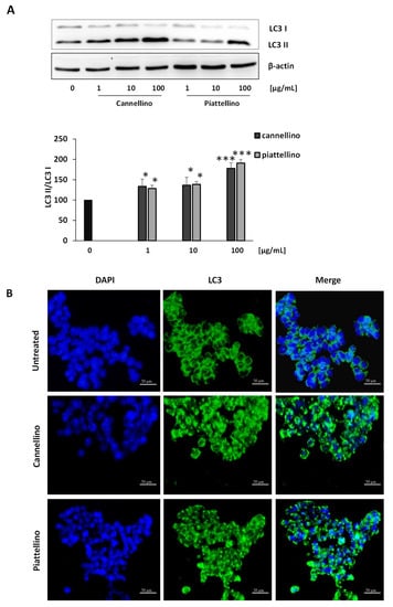 HT29 cells (7.5 × 104 cells/well) were seeded on glass coverslips that wereplaced into 24 multi-well plates and maintained in RPMI 10% FBS for 24 h. Cells were treated with Cannellino or Piattellino BF (100 µg/mL) and, after 24 h, fixed in acetone for 5 min. After blocking with 3% bovine serum albumin (BSA) for 1 h, cells were stained with the anti-LC3B antibody overnight at 4 °C. Samples were then incubated 1 h with fluorescein (FITC)-conjugated anti-rabbit (1:150, Alexa Fluor 488, ThermoFisher) and for 5 min with DAPI (0.1 µg/mL, cell signaling). Cells were examined with an ECLIPSE Ts2 microscope and images were obtained with NIS-Elements software (Nikon).