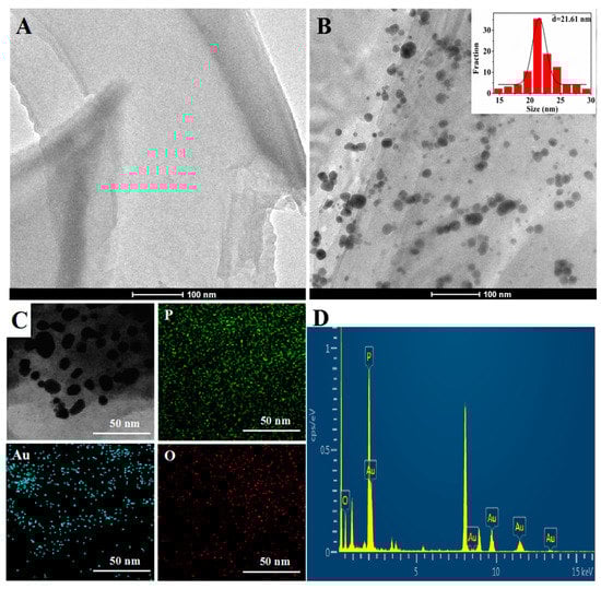 The morphologies of the as-prepared BPNS and AuNPs–BPNS were characterized by TEM technologies. The TEM micrograph of BPNS is presented in Figure 1A. BPNS presents a smooth surface with some wrinkles, which is a 2D nanostructure. Figure 1B shows the TEM patterns of AuNPs–BPNS nanocomposites. AuNPs were successfully synthesized on the surface of BPNS without other reduction and the inset of Figure 1B shows an average diameter of AuNPs of about 21 nm. Elemental analyses of the AuNPs–BPNS nanocomposites entailed EDX mappings of P, Au and O, where P and O originated from BPNS and Au indicated the presence of AuNPs (Figure 1C). Notably, AuNPs were uniformly distributed on the entire BPNS surface. As shown in Figure 1D, the EDX analysis further revealed the existence of P, Au and O in the nanocomposites.
