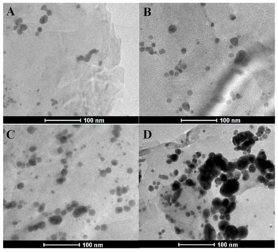 TEM images of AuNPs–BPNS synthesized while adding different concentrations of HAuCl4: (A) 10 mM; (B) 20 mM; (C) 25 mM; (D) 30 mM.