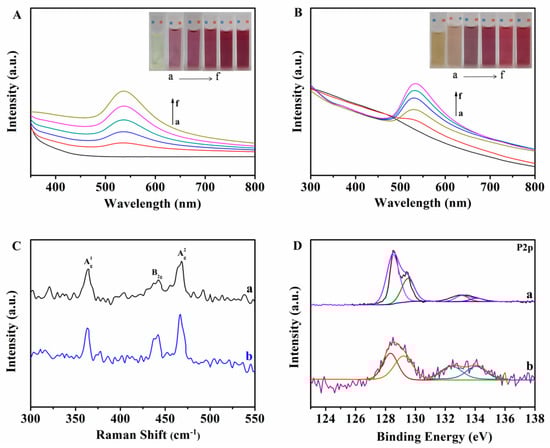 UV–Vis spectroscopy was conducted to characterize the formation process of the AuNPs. Figure 3A shows the UV–Vis spectrum of BPNS with different amounts of added HAuCl4. As the amount of BPNS increased, the absorption peaks of the AuNPs increased at 536 nm, demonstrating that the formation of the AuNPs is related to the BPNS. Additionally, the UV–Vis spectrum of HAuCl4 added to BPNS with the increase in mixing time is shown in Figure 3B. The absorption peak intensity of the AuNPs increased with the increase in time, and the color of the solution changed to different shades of a red color. The successful synthesis of AuNPs may be due to the edge-selective reduction of BPNS. Moreover, AuNPs can occupy the defects in BPNS to enhance the stability of BPNS [38]. Raman spectroscopy could provide detailed vibrational and rotational patterns for sample identification. Raman spectra of BPNS and AuNPs–BPNS are provided in Figure 3C. Three peaks are displayed at 363 cm−1, 440 cm−1 and 466 cm−1, which were ascribed to one out-of-plane phonon mode Ag1 and two in-plane phonon modes B2g and Ag2 for BP, respectively [39,40]. Upon AuNPs’ modification, the three peaks blue-shifted slightly because of vibration inhibition. Particularly, the B2g and Ag2 mode shift was larger than that of the Ag1 mode, indicating that AuNPs–BPNS possess an in-plane heterostructure. Furthermore, the changes in oxidation states of BPNS from pristine BPNS to AuNPs–BPNS were probed by XPS (Figure S1). In Figure 3D, curves a and b display the P2p spectra before and after AuNP modification, respectively. The two unchanged peaks near 128.5 and 129.5 eV verify the original state of BP, which is consistent with standard BP. The peak at 133 eV is due to oxidized phosphorus (i.e., POx) [41,42,43]. However, for AuNPs–BPNS (Figure 3Db), the POx peak was enhanced, demonstrating that some BP was oxidized in the formation of AuNPs–BPNS. The experimental data coincide with those reported in the literature [38].