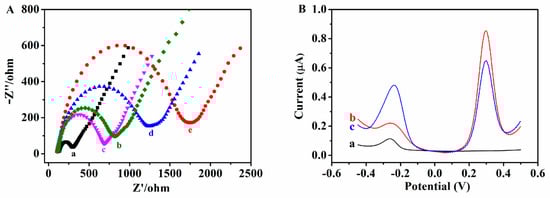 EIS is an efficient method for exploring the interfacial properties of the modified electrodes [44,45]. Therefore, the modification process was characterized by EIS to reveal the electrodes’ surface features. EIS measurement was performed in 5.0 mM K3[Fe(CN)6]/K4[Fe(CN)6] (1:1) solution containing 0.1 M KCl. The equipment was set at 5 mV of alternative voltage amplitude and 200 mV of applied potential, and the voltage frequencies ranged from 0.01 Hz to 100 kHz. The electron transfer resistance (Ret) was expressed by the diameter of a semicircle. As shown in Figure 4A, the bare GCE showed a small semicircle diameter (177 Ω, curve a), indicating a fast electron-transfer process. When BPNS was immobilized on the GCE, the semicircle diameter became bigger than that of bare GCE (704 Ω, curve b). As a result of the good electron transfer efficiency of the AuNPs, the AuNPs–BPNS/GCE exhibited a lower Ret (566 Ω, curve c) than BPNS/GCE, suggesting that AuNPs could efficiently enhance the electron transfer efficiency. After the assembly of the aptamer, the value of Ret increased to 1123 Ω (curve d) because the negatively charged aptamer and [Fe(CN)6]3-/4- anions repelled each other. With the hybridization between the aptamer and cDNA, the semicircle diameter further increased (curve e), which suggests the successful recognition of the aptamer and cDNA. The results of EIS verified that the aptasensor was successfully prepared (Scheme 1). Furthermore, XPS spectra for the C, N, Au and S energy regions are shown in Figure S2, which also verified the aptamer immobilization on AuNPs–BPNS.