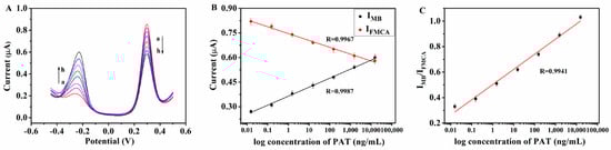(A) SWV curve of the aptasensor at different PAT concentrations (from curve a to h: 0, 0.0154, 0.154, 1.54, 15.4, 154, 1540 and 15,400 ng/mL) in PBS containing 10 μM FMCA. (B) Calibration curve of current of MB and FMCA for the detection of PAT. (C) Linear relationship between IMB/IFMCA and logarithm of the PAT concentration. The error bars were calculated on the basis of the standard deviation of three independent experiments.