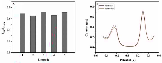 The reproducibility of the proposed aptasensor was evaluated by using five cDNA/aptamer/AuNPs–BPNS/GCEs for the detection of 0.154 μg/mL PAT under the same conditions (Figure 7A). The relative standard deviation (RSD) was calculated to be 4.5%, revealing significant reproducibility. Moreover, the aptasensor was stored under refrigeration for ten days. As shown in Figure 7B, 91.1% of the initial response of the current was obtained after adding the same amount of PAT (0.154 μg/mL), demonstrating the satisfactory stability of the proposed aptasensor.