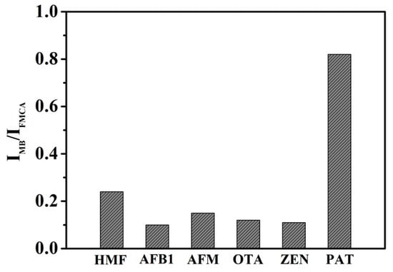 Furthermore, five kinds of contaminants in food samples containing hydroxymethylfurfural (HMF), aflatoxin B1 (AFB1), aflatoxin M1 (AFM), ochratoxin A (OTA) and zearalenone (ZEN) were used to verify the selectivity of the aptasensor. As shown in Figure 8, despite the fact that the concentrations of the interferences were as high as 10 μM, there were low values of IMB/IFMCA. However, an obvious response was obtained by the addition of PAT. The results indicated that the proposed dual-signaling aptasensor exhibits an excellent selectivity for PAT.