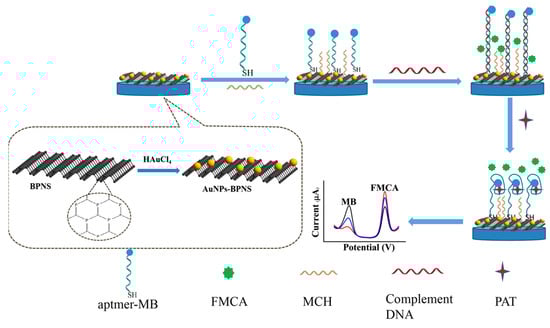 In summary, BPNS have potential value in the field of food safety detection. Metal nanoparticles, especially AuNPs, as an efficient catalyst, promote electron transfer on the AuNPs–BPNS, overcoming the defects of single metal nanoparticles. In this paper, in-plane gold nanoparticles–BPNS (AuNPs–BPNS) was synthesized, in which the high chemical activity of the defect sites in BPNS can edge-selective reduced HAuCl4, and the formed AuNPs not only enhance the stability of BPNS but also provide effective immobilization sites of the aptamer. The obtained AuNPs–BPNS nanocomposites were used to construct a dual-signaling aptasensor for PAT detection. Under optimum conditions, the proposed aptasensor was linear over the range of 0.0154 ng/mL–15.4 μg/mL. The electrochemical sensing platform has been successfully applied to the determination of PAT in apple, pear, and tomato extracts with good accuracy and reliability. Food safety detection methods based on functional nanomaterials will usher in new development opportunities in the future.
