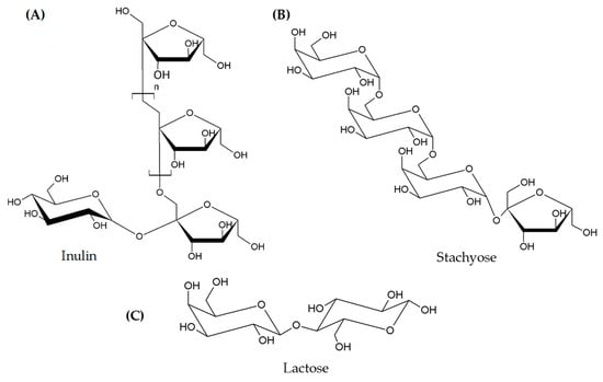 Examples of FODMAPs’ chemical structures. (A) Fructans: e.g., inulin composed by fructose units linked β(2-1) glycosidic bonds, with a total polymerization degree according to the origin plant; (B) Galacto-oligosaccharides: e.g., stachyose consisting of sucrose that has an α-D-galactosyl-(1→6)-α-D-galactosyl moiety attached at the 6-position of the glucose; (C) disaccharides: e.g., lactose made up of one unit each of glucose and galactose, joined by β-1, 4 glycosidic linkage.