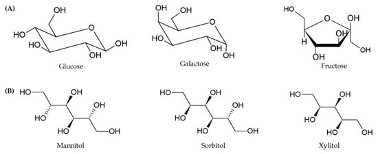 Examples of FODMAPs’ chemical structures. (A) Monosaccharides; (B) polyols.