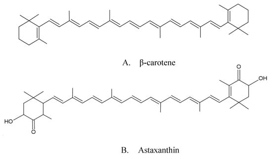 Carotenoid molecular structure: (A) example from carotene group; (B) example from xanthophyll group.