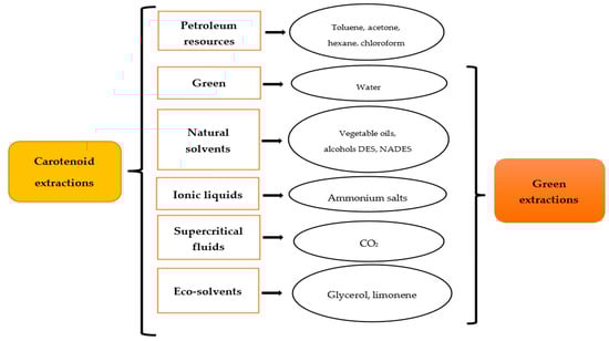 To date, other reviews have been published about various aspects of carotenoid extraction using nonconventional techniques and diverse sources of vegetables, fruits, plants, and algae [1,2,9,23]. However, the extraction of carotenoids using green solvents on vegetable by-products has not been analyzed. This review aims to discuss, compare, and provide information about the use of novel green solvents combined with green extraction techniques for the extraction of carotenoids from fruit and vegetable by-products. The following information regarding green solvents will be analyzed from the point of view of their recovery, the isolation of the extracted compound, their possible toxicological effects, and application in food products. The information in this review can contribute to a more sustainable utilization of fruit and vegetable by-products and the production of functional food products enriched with carotenoids extracted using green solvents.