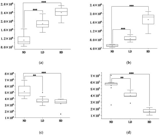 Boxplots of differential metabolites in adipose tissue of rats in HD, LD, and ND groups: (a) Glycine; (b) Isoleucine; (c) Octadecanoic acid; (d) Glutamine (“**” means p < 0.01, “***” means p < 0.001. ND group: Normal Diet group, n = 10; LD group: Low-dose Diet group, n = 10; HD group: High-dose Diet group, n = 10).