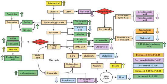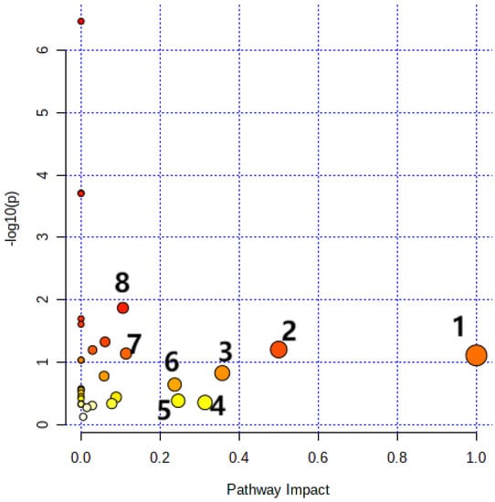 Data analysis was performed based on a previous research [14]. The normalized data were imported into SIMCA-P14.1 software (Umetrics, Umeå, Sweden). Data were analyzed with PCA model and PLS-DA model. Differential metabolites were determined based on variable importance in the projection (VIP > 1.0) and p-value (p < 0.05) gained from the Mann–Whitney U test in SPSS22.0 software (SPSS Inc., Chicago, IL, USA). Metaboanalyst 5.0 (https://www.metaboanalyst.ca/ (accessed on 26 February 2022)) and cytoscape software was utilized for metabolic pathway analysis.