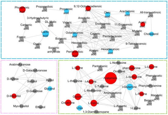 Metabolic pathways associated with Mep exposure when comparing with ND group. The depicted networks revealed red nodes represent significantly upregulated metabolites, blue nodes represent significantly downregulated metabolites that were involved in the affected metabolites, and gray nodes represent no significant changes in metabolites. The size of the node was positively correlated with the fold change between the HD group and ND group (Mep: Mepiquat; ND group: Normal Diet group, n = 10; LD group: Low-dose Diet group, n = 10; HD group: High-dose Diet group, n = 10).