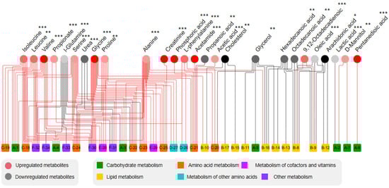 Network analysis of differential metabolites and metabolic pathways at Mep-exposed groups shows that there are twenty-six differential metabolites. “*” means p < 0.05, “**” means p < 0.001, “***” means p < 0.0001. The red circles and black circles show upregulation and downregulation of metabolites, respectively. Intensity of the color displays the metabolite fold change. A total of thirty-four metabolic pathways (squares) were classified as six metabolic pathways (Table S2), with different metabolites connected by the red line (upregulation) and black line (downregulation).