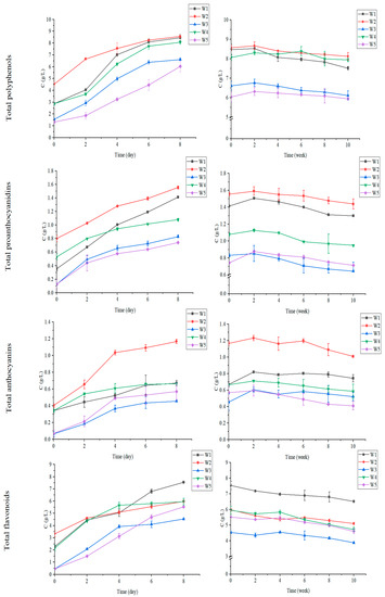 Total polyphenols, total proanthocyanidins, total anthocyanins and total flavonoids in black chokeberry wine. The left graph shows the alcoholic fermentation stage; the right graph shows the maturation stage. W1—wine made by traditional fermentation; W2—wine made by frozen fruit fermentation; W3—wine made by co-fermentation; W4—wine made by carbonic maceration; W5—wine made by co-carbonic maceration.
