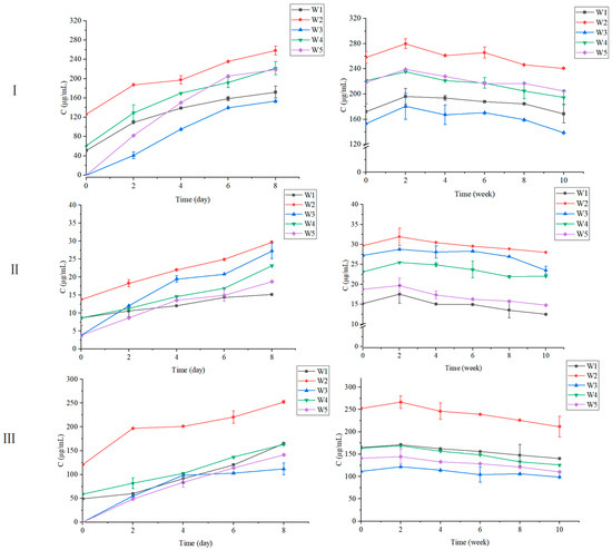 Variation in the contents of the major anthocyanins in black chokeberry wines during alcoholic fermentation period (left graph) and maturation period (right graph). (Ⅰ). Cyanidin-3-O-galactoside, (Ⅱ). Cyanidin-3-O-glucoside, (Ⅲ). Cyanidin-3-O-arabinoside. W1—wine made by traditional fermentation; W2—wine made by frozen fruit fermentation; W3—wine made by co-fermentation; W4—wine made by carbonic maceration; W5—wine made by co-carbonic maceration.
