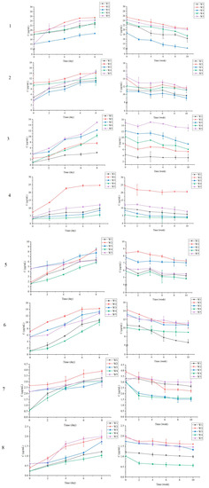 The variation of the contents of chlorogenic acid, epicatechin, caffeic acid, rutin, astragalin, isoquercetin, myricetin and quercetin from fermentation to maturation were monitored by HPLC and the results are presented in Figure 3. According to Figure 3, the contents of the eight non-anthocyanic phenolic compounds in all experimental black chokeberry wines increased significantly during the period of alcoholic fermentation and then decreased during the first stage of the maturation period, followed by a trend toward stability.