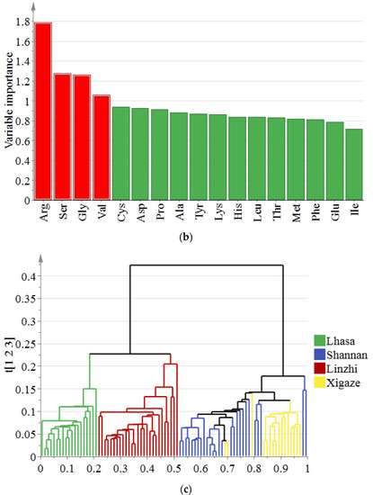 To make a preliminary assessment, based on amino acids, of the reliability of a multivariate separation for classifying the four regions where Tibetan chicken in Tibet are present, discriminant analyses were performed. All of the seventeen amino acids in the Tibetan chicken samples were analyzed by OPLS-DA (Figure 2a). The OPLS-DA model was validated by 7-fold cross-validation, which is an internal prediction validation method wherein the parameters R2 (cumulative) and Q2 (cumulative) define the accumulated explained variance and derived model predictability, respectively. These were then used to assess the OPLS-DA model’s performance [29]. In Figure 2a, the values of R2Y and Q2 of the OPLS-DA model are 0.733 and 0.587, respectively, thus satisfying R2Y > Q2 > 0.50— which indicates that the model is adequate for fitting and prediction [30]. The OPLS-DA score plots of the four cities could bind the data into four classes, based on amino acids: Linzhi samples (red dots) and Lhasa samples (green dots) could almost be separated from the other samples, but the chickens from Shannan (blue dots) and Xigaze (yellow dots) overlapped. The variable influence on projection (VIP) value (Figure 2b), as calculated by the OPLS-DA model, could quantify the contribution of each variable to the classification. The greater the VIP value, the more significant the difference of variables among the different regions where Tibetan chicken are present [31]. There were four variables (Arg, Ser, Gly, and Val) that had higher importance values (>1). These variables were used in order to distinguish the Tibetan chicken in the four areas. Tang et al. found that Arg, Gly, and Ser are the main amino acids that can be used to distinguish musk at different altitudes [32]. Moreover, Arg and Val are differential markers that can be utilized to distinguish the Jersey cattle that are raised at different altitudes [33]. Thus, these four amino acids of Arg, Ser, Gly, and Val were associated with important altitude metabolic pathways. In addition, the results obtained after HCA are displayed as a dendrogram (Figure 2c), and all samples were grouped based on similarity. There are four well-defined clusters are visible, and just three Xigaze samples (yellow lines) were wrongly classified into Shannan samples (blue lines). The results of the HCA were similar to the OPLS-DA score plots, and the two discrimination results verify each other.