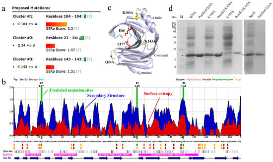 Protein unfolding promotes an increase in the conformational degrees of freedom of the amino acid backbone. Stable amino acid substitutions have a positive effect on stabilizing the conformational stability of protein folding [22]. Surface entropy reduction combines conformational entropy mapping, secondary structure prediction, and sequence conservation for predicting highly flexible hydrophilic residues and replacing residues with high conformational entropy, such as Lys and Gln, with amino acids without side chain-conformational entropy or with low conformational entropy, such as Ala, Tyr, and Thr. This reduces the conformational entropy of the protein [60]. The predicted sites are usually located on the protein surface, and are poorly conserved evolutionarily and far from the catalytic center of the enzyme. A comprehensive analysis of XynA sequence conservation, solvent accessibility, and secondary structure features was performed to compare the predicted surface entropy reduction fractions capable of reducing conformational entropy [61]. Three high-entropy residues, Q24, K104, and K143 were located in the non-catalytic region on the protein surface (Figure 1a, b). Q24 and K143 were located in the loop region of the protein secondary structure, and K104 was located in the β-sheets near the α-helix (Figure 1c). SDS-PAGE analysis showed that XynA migrated as a band and the molecular weight was approximately 20.80 kDa (Figure 1d).