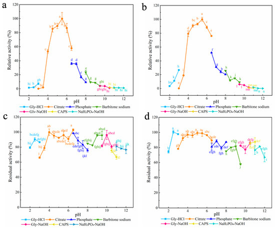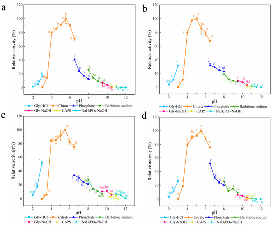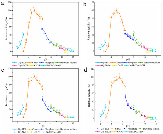 The optimum pH of disulfide mutant enzymes and XynA. (a) XynA-VT; (b) XynA-NT; (c) XynA-SN; (d) XynA. The optimal pH was measured at 37 °C for 10 min in different buffers (50 mM) from 2.0 to 12.0, using beechwood xylan as substrate; buffers used were 50.00 mM Gly-HCl buffer (2.0–3.0), citrate buffer (pH 3.0–6.5), phosphate buffer (pH 6.5–8.0), barbital sodium buffer (pH 8.0–9.5), Gly-NaOH buffer (pH 9.5–10.5), CAPS buffer (pH 10.5–11.0), NaH2PO4-NaOH buffer (pH 11.0–12.0); the highest enzyme activity was used as 100%. Means within rows followed by the same letter were not significantly different (p < 0.05).