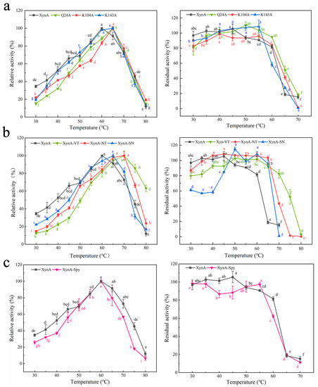 The optimal temperature (left) and thermostability (right) of XynA and its mutants. The optimum temperature was measured in 50 mM citrate buffer (optimum pH) at different temperatures (30–80 °C), and the highest enzyme activity was used as 100%; thermostability was determined by incubating at varying temperatures (30–80 °C) in 50 mM citrate buffer (optimum pH) for 30 min; the activity of untreated xylanase was defined as 100%. (a) The optimum temperature and the thermostability of SER mutated enzyme. (b) The optimum temperature and the thermostability of disulfide mutant enzyme. (c) The optimum temperature and the thermal stability of XynA-Spy. Means within rows followed by the same letter were not significantly different (p < 0.05).