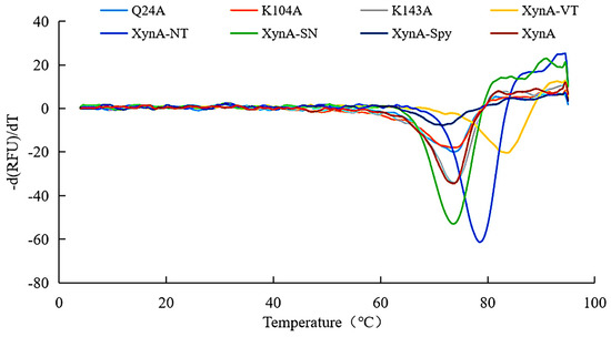 The optimum temperature for Q24A and K104A was 65 °C, and the optimum temperature for K143A was 60–65 °C (Figure 3a). The optimum temperatures of all three mutant enzymes were higher than that for XynA (60 °C). The residual activities of Q24A and K104A were all above 41.23% when the temperature was held at 65 °C for 30 min, which was an increase compared with XynA (18.70%). However, the thermostability of K143A decreased compared with XynA. After incubation at 60 °C for 30 min, the residual activity of K143A was only maintained at approximately 58.37%, which was 23.14% lower than that of XynA (Figure 3a). The half-lives of Q24A and K104A were 76.17 and 88.87 min, respectively, and were similar to that of XynA (86.64 min). The half-life of K143A (69.31 min) decreased by 17.33% compared with XynA. This indicated that the thermostability of K143A at 60 °C was lower than that of XynA. The thermostability of recombinant xylanase was evaluated at the protein thermodynamic level, and the thermal denaturation temperatures (Tm) of Q24A, K104A, K143A and XynA were determined using Protein Thermal Shift ™. The Tm for Q24A, K104A, K143A, and XynA were all approximately 73.50 °C. The enzyme structure was relatively stable, which was not reflected in the thermodynamic parameters (Figure 4) (Table 1).