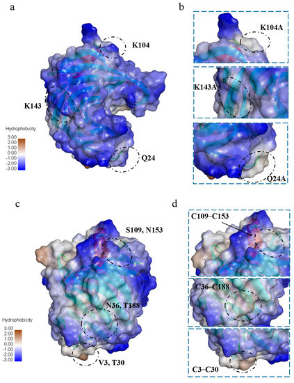 Additionally, the GRAVY values of Q24A, K104A, and K143A were −0.55, and were lower than the GRAVY value of XynA (−0.58). This difference indicated that when the high-entropy amino acid was mutated to low-entropy Ala, the local hydrophobicity of the protein surface increased (Figure 6). At the same time, interaction of the amino acid side chain with the solvent at this position was reduced, which was beneficial to the enzyme stability. Pace et al. measured conformational stability changes (∆G) for four proteins with the addition of hydrophobic interactions and found that hydrophobic interactions were the dominant determining factor of protein stability at approximately 60.00% [65]. Protein stability is enhanced by hydrophobic interactions because the hydrophobic environment provides 1.30 ± 0.50 kcal/mol of energy to stabilize the protein for each additional -CH2- group [66]. An increase in hydrophobic interactions decreases the rate of protein unfolding in a thermal environment [67]. Xing et al. combined qualitative evolution and rational design to obtain a mutant of GH11 xylanase, Xyn376, with a half-life of 720.00 times that of the wild enzyme at 70 °C [68]. Structural analysis revealed that hydrogen bonding and hydrophobic interactions were mainly responsible for the enhanced thermostability. Although the local hydrophobicity of K143A was enhanced, hydrogen bonding interactions with the surrounding amino acids decreased. It was speculated that the energy provided by hydrogen bonding at this position was greater than that provided by the hydrophobic interaction, and this reduced the thermostability.