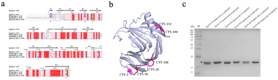SDS-PAGE analysis of the purified mutants is shown in Figure 7c. The presence of disulfide bonds was verified using the method of Wakarchuk et al. [72]. Because dithiothreitol (DTT) is highly reductive and can reduce disulfide bonds in proteins, a mutant enzyme with reduced disulfide bonds binds more SDS and migrates more slowly during SDS-PAGE. Therefore, the pure enzyme solution was treated with different concentrations of DTT to verify the formation of disulfide bonds. The pure enzyme solution treated with 10.00 mM DTT showed a thicker protein band at approximately 20.00 kDa, which was close to the predicted value of 20.80 kDa. This result indicated that expression of XynA-VT, XynA-NT, XynA-SN, and XynA-SN mutants with disulfide bonds and mutant enzymes was not reduced. XynA-SN was successfully expressed and purified. The purified enzyme solution treated with 2.50 mM DTT formed two bands because of incomplete disulfide bond disruption, which indicated that disulfide bond formation was successful.