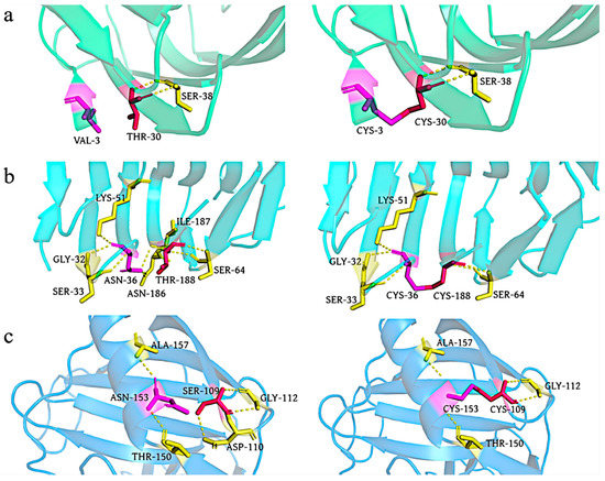 The disulfide bond is a covalent bond that can connect the enzyme’s secondary structure, reduce its fluctuation and unfolding, and reduce the conformational entropy of the protein to improve the structural stability of the protein, which is important for the thermostability of enzymes [23]. Tang et al. introduced a disulfide bond F14C–Q52C between the two β-sheets (A2 and A3) of GH11 xylanase Xyn2, and found that the half-life of the mutant at 60 °C (9.60 min) increased to twice that of the original enzyme (3.90 min) [69]. Teng et al. introduced a disulfide bond, T2C–T29C, between the N-terminal loop region of xylanase PjxA and β-sheet A2, and found that the optimum temperature of mutant PjxA-DB was 65 °C, which was 15 °C higher than that of the original enzyme [52]. Sequence alignment of XynA with modified enzymes containing disulfide bonds with better thermostability will help to identify potential sites for constructing disulfide bonds, and to design corresponding cysteine mutations to improve the thermostability of the enzyme. By comparing the sequences of XynA with the modified enzymes PTxA-DB [70], XynZFTA [71], and xyn11A-SS [34] (Figure 7a), potential sites for constructing disulfide bonds were found at the N-terminal, C-terminal, and between the α-helix and β-sheet of XynA, V3C−T30C, N36C−T188C, and S109C−N153C, respectively. Three mutant enzymes, XynA-VT, XynA-NT, and XynA-SN were designed with disulfide bonds (Figure 7b).