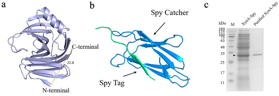 The 3D model structure of XynA and SpyRing. (a) The 3D model structure of XynA; the yellow dashed line connects the N-terminal with the C-terminal, and the numbers showed their distances. (b) The 3D model structure of SpyRing was composed of two parts, Spy Tag and Spy Catcher. (c) SDS-PAGE analysis of XynA and XynA-Spy before and after purification. Lane M, protein marker.