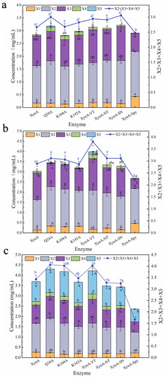 The yield of hydrolytic products of wild-type XynA and mutants with beechwood xylan (a), birchwood xylan (b), and oat-spelt xylan (c) at pH 5.0, 50 °C for 8 h. XOS standard markers, X1, xylose; X2, xylobiose; X3, xylotriose; X4, xylotetraose; and X5, xylopentaose. Means within rows followed by the same letter were not significantly different (p < 0.05).