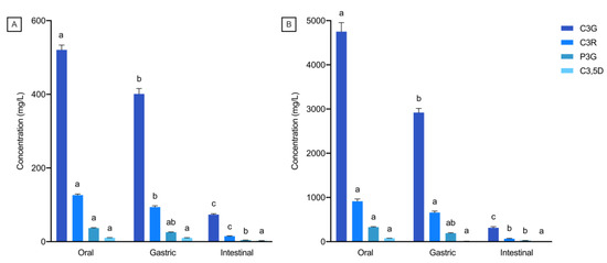 To determine the effects of food matrices and digestive phases on the gastrointestinal accessibility of anthocyanins, the anthocyanin content in each digestion phase was quantified for both 4FO and 4CO samples. Aliquots of digesta from the end of each simulated digestion phase (oral, gastric, and intestinal) were centrifuged at 8000× g at 20 °C for 10 min to quench the mixtures. The supernatants were collected for anthocyanin content determination, as described in Section 2.5. The accessibility of anthocyanins was expressed as a ratio of the anthocyanin content in the supernatant relative to that in crude BRAE.