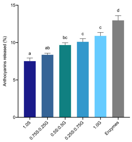 Total accessible anthocyanins from matrices of varying starch and gluten distributions, expressed as a percentage of initial total anthocyanins in the corresponding matrices. S: starch; G: gluten. Values are represented as means and standard error of means. Statistical differences in accessible anthocyanins across different matrices are represented by different lowercase letters.