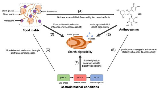 The combined influence of anthocyanins, food matrices, and gastrointestinal conditions on starch digestibility. (A–C) Inter-relationship among the factors that directly influences starch digestibility. (D–F) Factors that have a direct influence on starch digestibility.