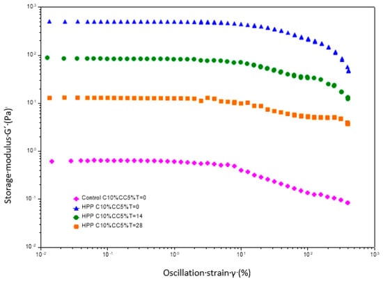 Amplitude sweep curves of storage modulus (G′) for the control sample and treated samples at different sampling times. Legend: HPP-High-pressure processing; C10%CC5%-Casein 10%, Cocoa 5%; T = 0, T = 14, T = 28. Different storage times at time 0, 14 days and 28 days.