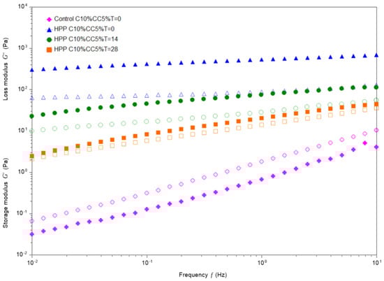 Frequency sweep curves for the control sample and treated samples at different sampling times. Storage modulus (G′): closed symbols; loss modulus (G″): open symbols. Legend: HPP-High-pressure processing; C10%CC5%-Casein 10%, Cocoa 5%; T = 0, T = 14, T = 28. Different storage times at time 0,14 days and 28 days.