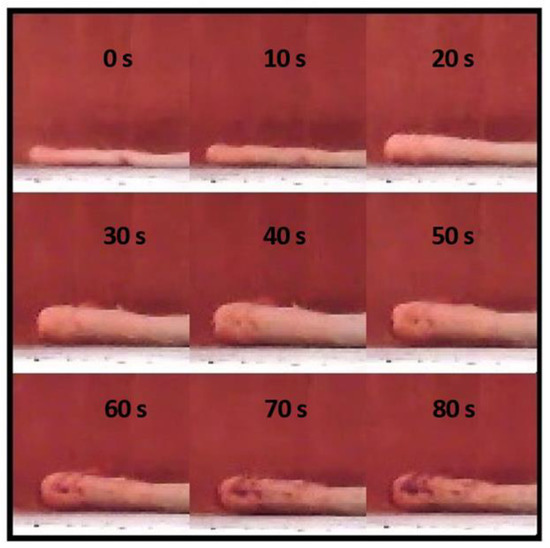 During pizza baking, the heat received by the rim makes it expand because of local water evaporation. A thermal imaging camera was used to monitor the time course of its height (h) when baking different pizza samples of A–D type (Table 1), as shown for instance for the pizza sample D in Figure 1. An initial rapid growth of the edge occurred during the first 40 s, followed by a slower one in the following 40 s.