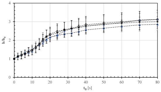 Effect of baking time (tB) on the average value and standard deviation of the ratio between the instantaneous (h) and initial (h0) heights of the raised rim of different pizza samples (A, ▲; B, △; C; ●; D, ○) during their baking in a pilot-scale wood-fired oven.