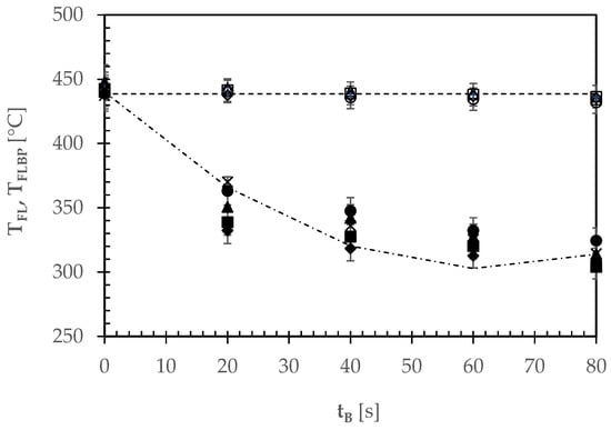 Time course of the average temperatures of the oven floor as exposed to fire (TFL: open and + symbols) or shielded by the pizza sample (TFLbp: closed and ✕ symbols) throughout the baking tests of different pizza types: A, ○, ●; B, △, ▲; C, □, ■; D, ◊, ◆; E, +, ✕. The horizontal broken line shows the average temperature of the oven floor around any pizza undergoing baking, while the dash-dotted line shows the quadratic regression line used to simulate the temperature profile of the oven floor under a tomato pizza (C).
