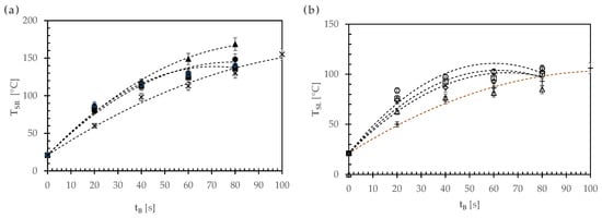 Time course of the average temperatures of (a) the raised rim (TSR: closed and ✕ symbols) and (b) lower area (TSL: open and + symbols) of all the pizza samples during the baking tests of different pizza types: A, ●, ○; B, ▲, △; C, ■, □; D, ◊, ◆; E, ✕, +. The broken lines were calculated using the specific least squares quadratic regressions.