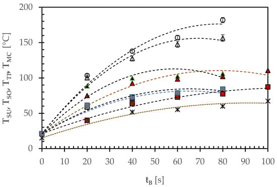 Figure 5 shows the time course of the average temperature (TSU) of the upper area of the pizza samples examined in this work. This temperature was related to the area devoid of any ingredient in the case of white pizza (A) or spread with sunflower oil (B) or tomato puree (C) only. In the case of pizza D, its central area having been spread with SO and TP, the thermal imaging camera was able to determine the average temperatures TSO and TTP of both areas. In the case of pizza E, the average temperatures of the areas covered with TP, SO, or mozzarella cheese pieces were measured.